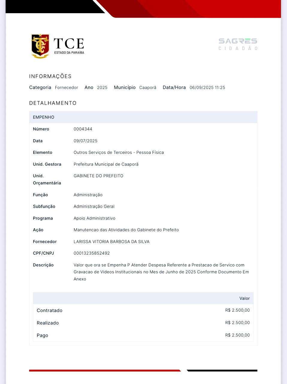 O pagamento de R$ 2.500,00 realizado pela Prefeitura de Caaporã, registrado no sistema SAGRES Cidadão do Tribunal de Contas da Paraíba (TCE-PB), vem gerando questionamentos na cidade e fora dela. O documento oficial aponta que a fornecedora Larissa Vitória Barbosa da Silva foi contratada para a gravação de um vídeo institucional no mês de junho de 2025, a serviço do Gabinete do Prefeito.