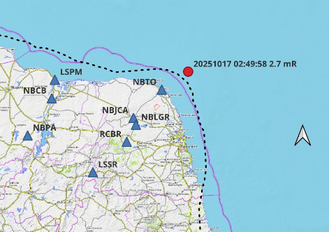 Um tremor de terra foi registrado na madrugada desta sexta-feira (17) próximo ao litoral da Paraíba, a cerca de 42 quilômetros de Touros, município do litoral norte do Rio Grande do Norte. A informação é do Laboratório Sismológico da Universidade Federal do Rio Grande do Norte (LabSis).