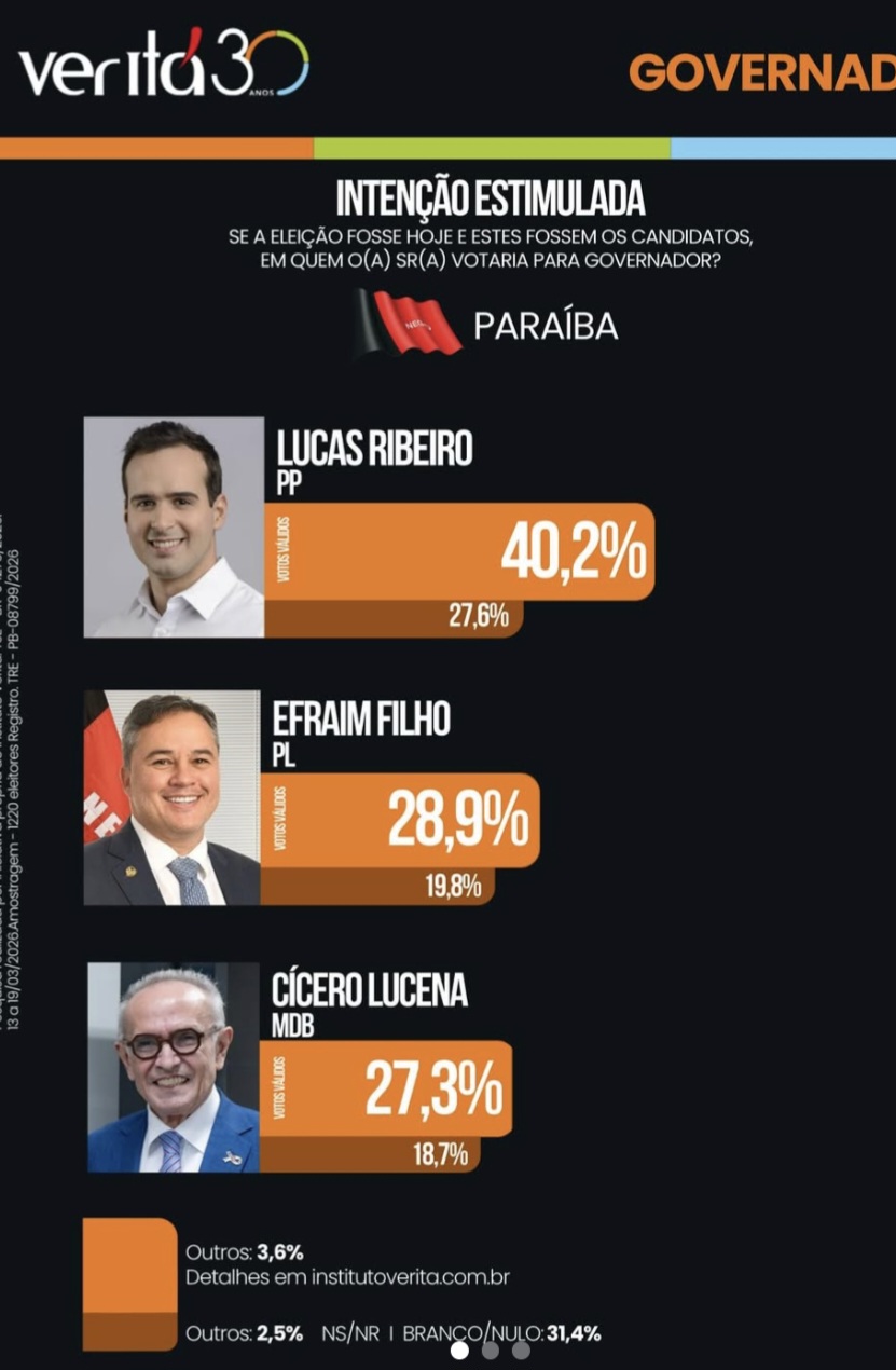 O governador da Paraíba, Lucas Ribeiro (PP), aparece em primeiro lugar, com 40,2% das intenções de voto, na disputa ao Governo da Paraíba nas Eleições de 2026. Dados são da pesquisa eleitoral do Instituto Veritá, divulgada na noite desta quarta-feira (8).